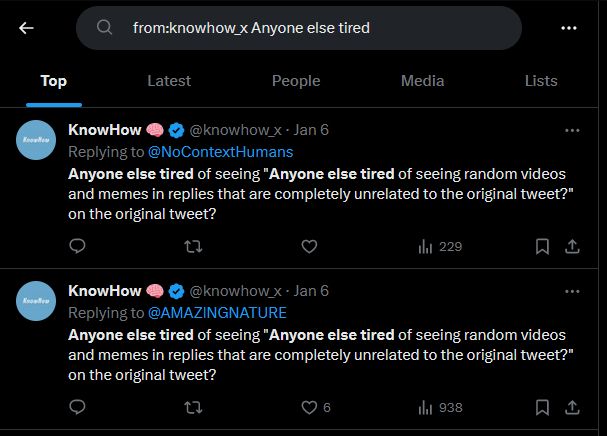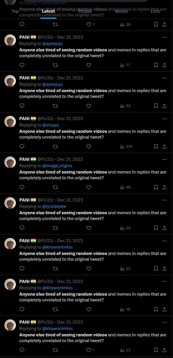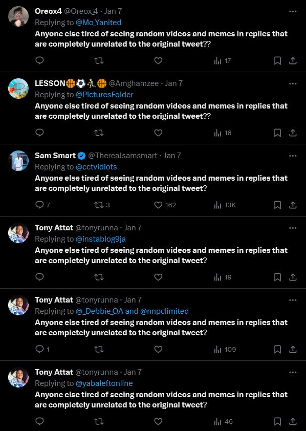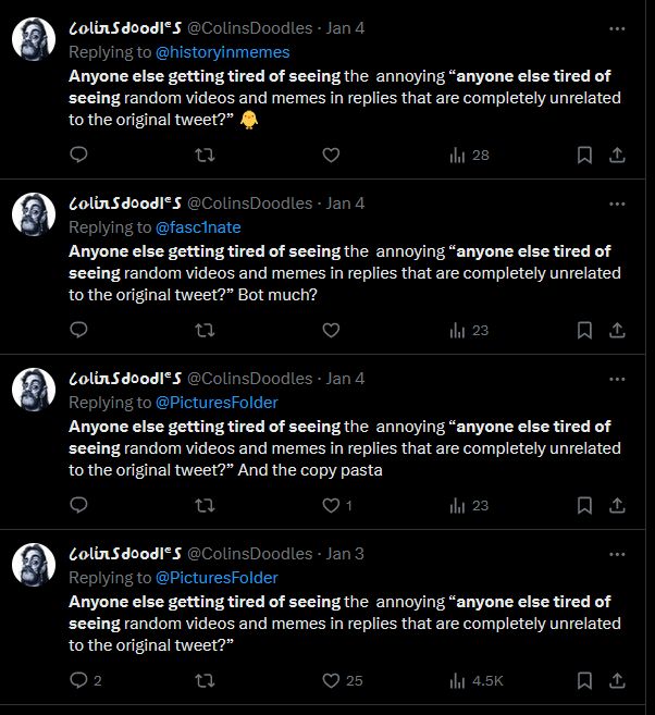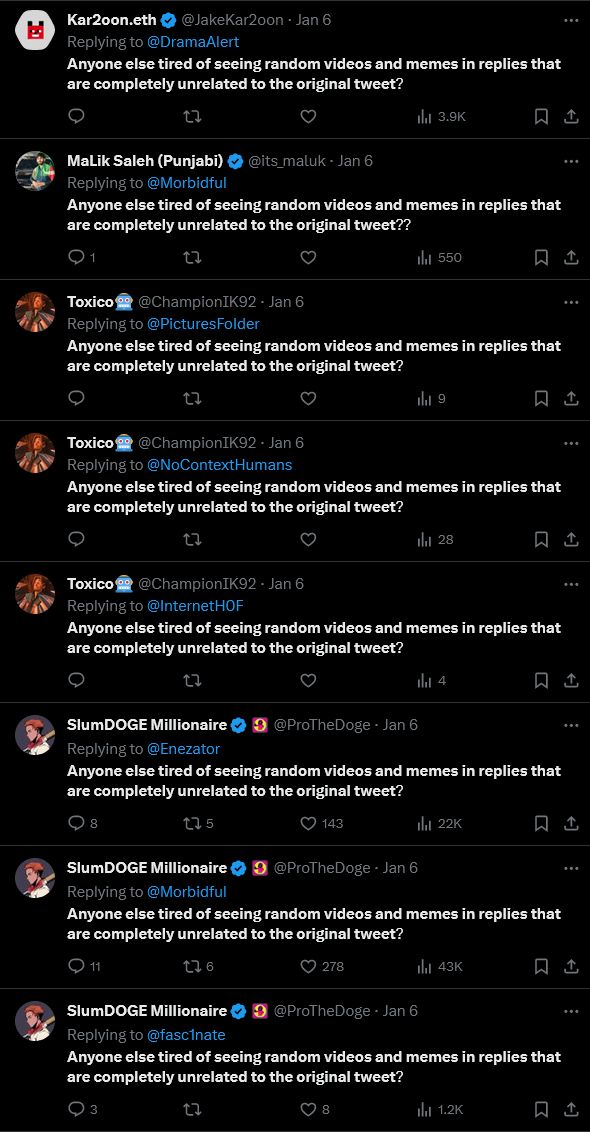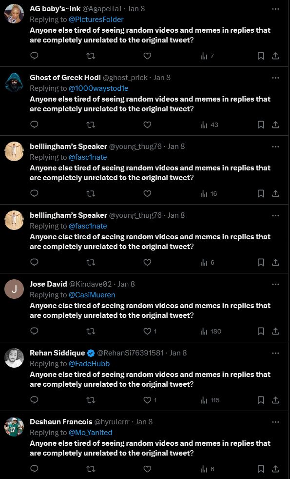 Screenshots of Twitter users repeatedly saying 'Anyone else tired of seeing random videos and memes in replies that are completed unrelated to the original tweet?' From being a cry against the state of Twitter replies, it itself became a statement of spam, with hundreds of accounts, verified or otherwise, spamming the statement onto posts.
