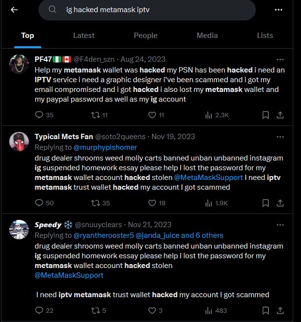 Metamask, IPTV and "sugar daddy" are terms so corrupted by reply bots, that is now a joke to spam these terms in one tweet to attract the most amount of bots possible.